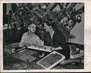 1948 Press Photo Mrs. Kathleen Martin hands Christmas gifts to his son