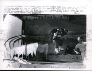 Duke, the chimp, star of the 1962 chimpanzee show at the St. Louis Zoo. contemplates the floor from mid-air after sailing off the end of a ski jump on roller skates. Trainer Mike Kostial shouts encouragement.