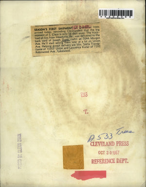 1957 Press Photo Joe Dunn, Larry Kunar with Xmas trees for Cleveland Ohio