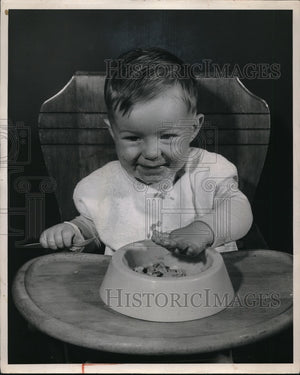 1948 Press Photo Little cutie Sean M O'Dohery with his table dish