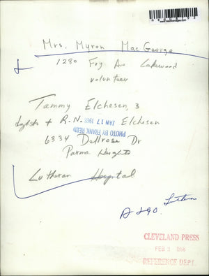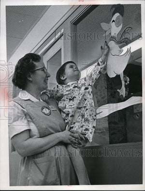 Mrs. Myron MacGeorge of 1280 Fry Ave. Lakewood volunteer holding Tommy Elchesen, a 3 year old boy