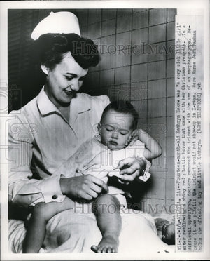 1951 Press Photo Kathryn Eskew and Nurse Jean Parham with Toy Baby Swallowed