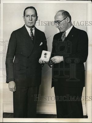 1931 Press Photo Paul Wolman and Gen. Douglas MacArthur looking at a medal