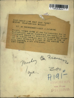 1932 Media Photo Mickey, monkey at the Fleishhacker Zoo, getting teeth cleaned