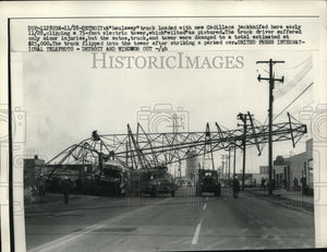 1958 Press Photo Detroittruck with new Cadillasc jackknifed clipping
