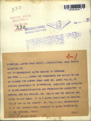 James L. Tullis was a leading blood researcher and made substantial contributions to the field of hematology. During his career, he developed a method of storing human red blood cells of rare blood types for clinical use. Dr. Tullis also worked closely with Edward Cohn to create the Cohn fractionator.
