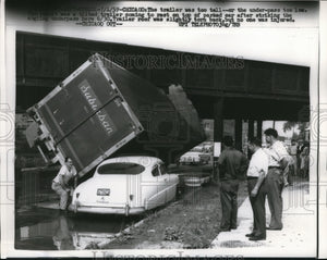 1959 Media Photo Chicago, Semi truck tips over on auto parked at side of road
