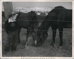 1951 Media Photo Johnny Mikulin watches a filly and her stallion enjoy weather