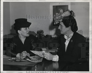 Mrs. Edna Blue (black hat), executive chairman, Foster Parents' Plan For War Children, receives a first hand report on the conditions of children rescued from German concentration camps, from Mrs. Bernard F. Gimbel, vice president of the AWVS, who just returned from colonies operated by the Foster Parents' Plan in England and Malta.