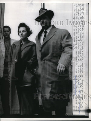 Mrs. Joyce Smith leaving the Justice Building with Sheriff's Dep. R. H. Linton (R), was charged with the pistol slaying of her husband, Capt. Jack M. Smith, who was shot in the backyard of their home.