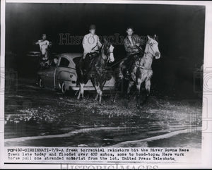 Rainsorm hit the River Downs Race Track flooded over 400 autos. Horse pull one stranded motorist from the lot.