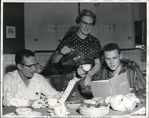 1956 Press Photo Father And Son Both Study While Having Breakfast