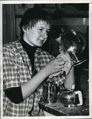 1956 Press Photo Silversmithing Student Angela Pruden with English Teapot