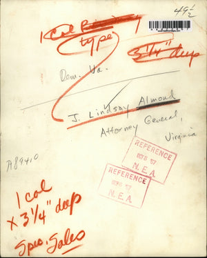 1957 Press Photo J. Lindsay Almond, Attorney General, Virginia