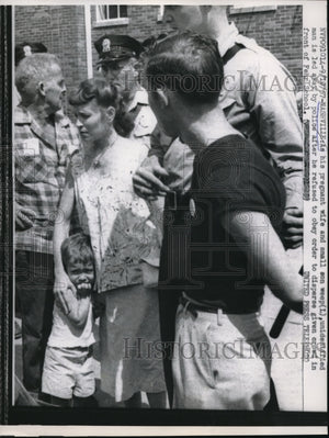 1957 Press Photo Unidentified Man Led By Police As Pregnant Wife & Son Watch