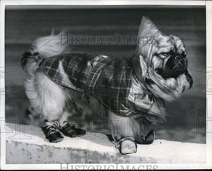 1952 Press Photo Pekingese Dog from Detroit in Coat and Shoes at Miami Beach