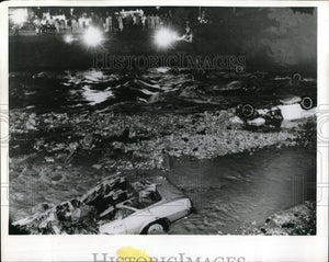 cancelling All Star game and stranding hundreds of motorists photo shows overturned cars from dealers lot floated down flooded creek