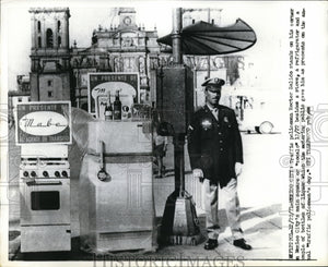 1971 Press Photo Hector Salido Stands Next to Gifts in Zocalo, Mexico City.