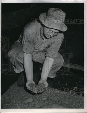 1947 Press Photo James Bonesteel Examines 500 Tons Of Lead Shotgun Pellets