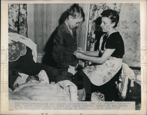 1948 Press Photo A homeless child with Mrs. Mervin Ness getting clothes.