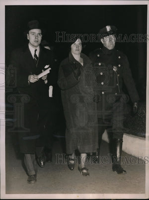 Mrs. Helen Benshoff, of Arkansas City, KS, is shown being escorted by Nassau County, NY detectives from the plane in which she was brought to Newark Airport, NJ, to the police plane which county authorities placed at her disposal. She was landed at Roosevelt Field, Long Island and rushed to the bedside of her son, Ralph, 8, who lay stricken with meningitis.