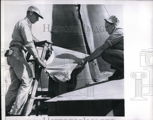 1950 Press Photo Navy Workers Peel Off Protective Plastic Skin