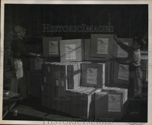 1946 Press Photo C. McClung & schoolboy helper stack packages of holly wreaths