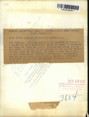 his return to US on liner Mariposa after spending year and a half in the interior of Austrailia gathering a collection of fossils
