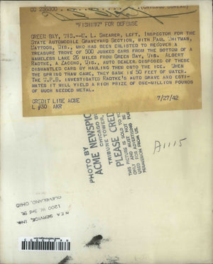 1942 Press Photo M.L Shearer and Paul Whitman Recovering Junked Cars from Lake