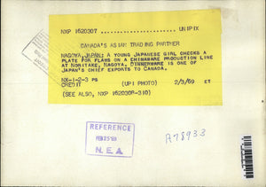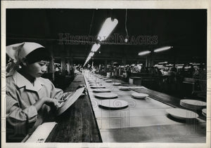 1969 Press Photo Japanese Girl Checking Plate for Flaws in Chinaware Prodcution