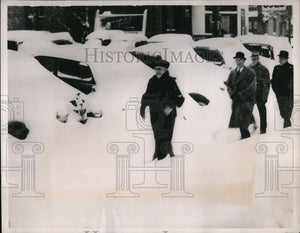 1939 Press Photo Cars in deep snow as pedestrians make their way to work