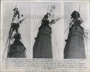 Steepljacks getting ready to remove weather vane from top of Christ Church 1st Episcopal Church in US
