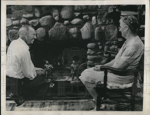 1948 Press Photo Fireplace of Ranch-Type Log Cabin Tended by Charles Findley