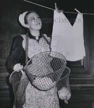 1953 Press Photo London invention by F J Hutchins leaves laundress smiling