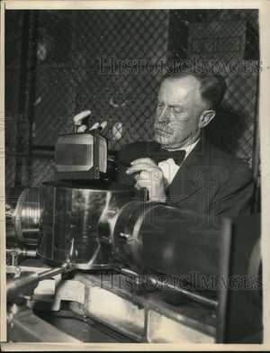 1933 Press Photo Dr W E Forsythe, Nela Park Ohio holding one of the Quartz