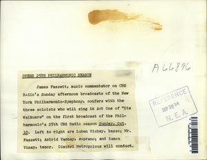 bradcast of the New York Philharmonic Symphony confers with soloists Luben Vichey, Astrid Varnay and Ramon Vine who will sing in Act one of Die Walkuere on first broadcast of the Philhamonics 25th CBS radio season
