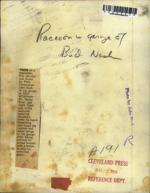1955 Press Photo Treed on a stepladder this raccoon was found by Press camerama