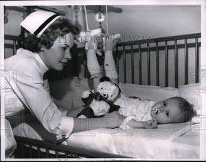 1957 Press Photo Peter Makrinski with broken leg with nurse Shirley Samelson