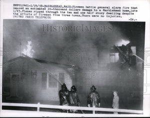 1958 Press Photo Firemen battle general alarm fire in Marblehead, Massachusetts