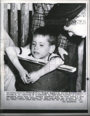 1959 Press Photo Douglas Kitchen wedged tightly in oil drum with police officer