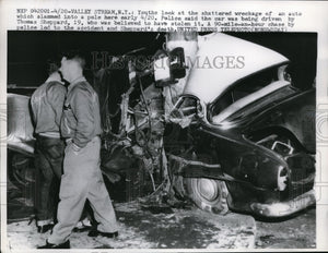 1957 Press Photo Youths look at shattered wreckage of auto that slams into pole