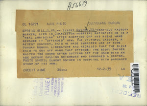 1939 Press Photo Elbert Snyder in hospital with bandage stump of his arm