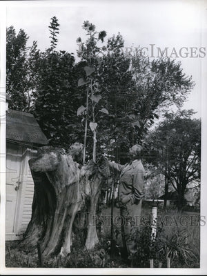 1955 Press Photo Aurey D. Strophaul inspects large growing sunflower
