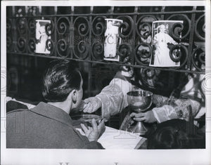 For the recovery of Pope Pius XII in Vatican City, A priest served Communion through a railing decorated with pictures of his holiness.