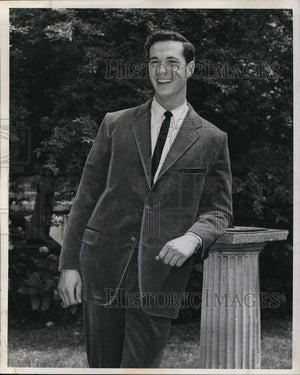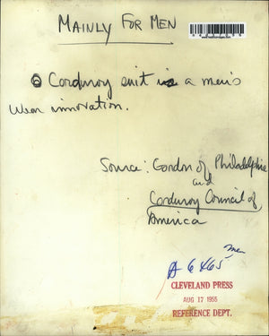 A young man poses showing off a Corduroy suit as men's wear innovation titled "Mainly for Men", Sources are Gordon of Philadelphia and Corduroy Council of America