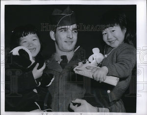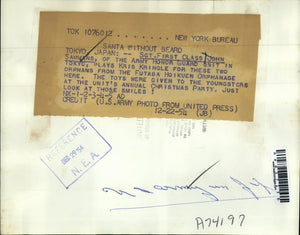 Unit in Tokyo plays Kris Kringle for these 2 orphans from the Futaba Hoikuen Orphanage. The toys were given to the youngsters at the Unit's Annual Christmas Party