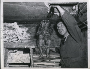 1947 Press Photo Allen Gisch Removes Week Old Puppy Through A Hole In A Basment