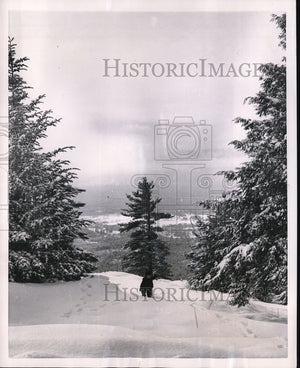 by tall trees as he explores snow trails of Cranmore Mountain. He was on ski holiday with his parents
