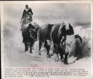 Bob Howard drives climate weakened cattle down the icy road. This road was cleared by the Army bulldozer and snow clearing vehicles assigned to Operation Snowbound.
