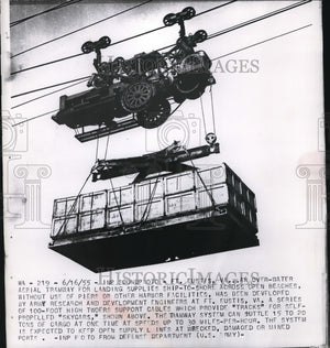 Army Research and Development Engineers has been develop an over water aerial tramway for landing supplies ship to shore across open beaches, without the use of Piers or other Harbor facilities. A 100 foot high towers support cables which provide "Tracks" for selfpropelled "Skycars". The Tramway system can shuttle 15 to 20 tons of cargo at one at a time with the speed up to 30 miles per hour. This system is expectted to supply lines at wrecked, damage port.